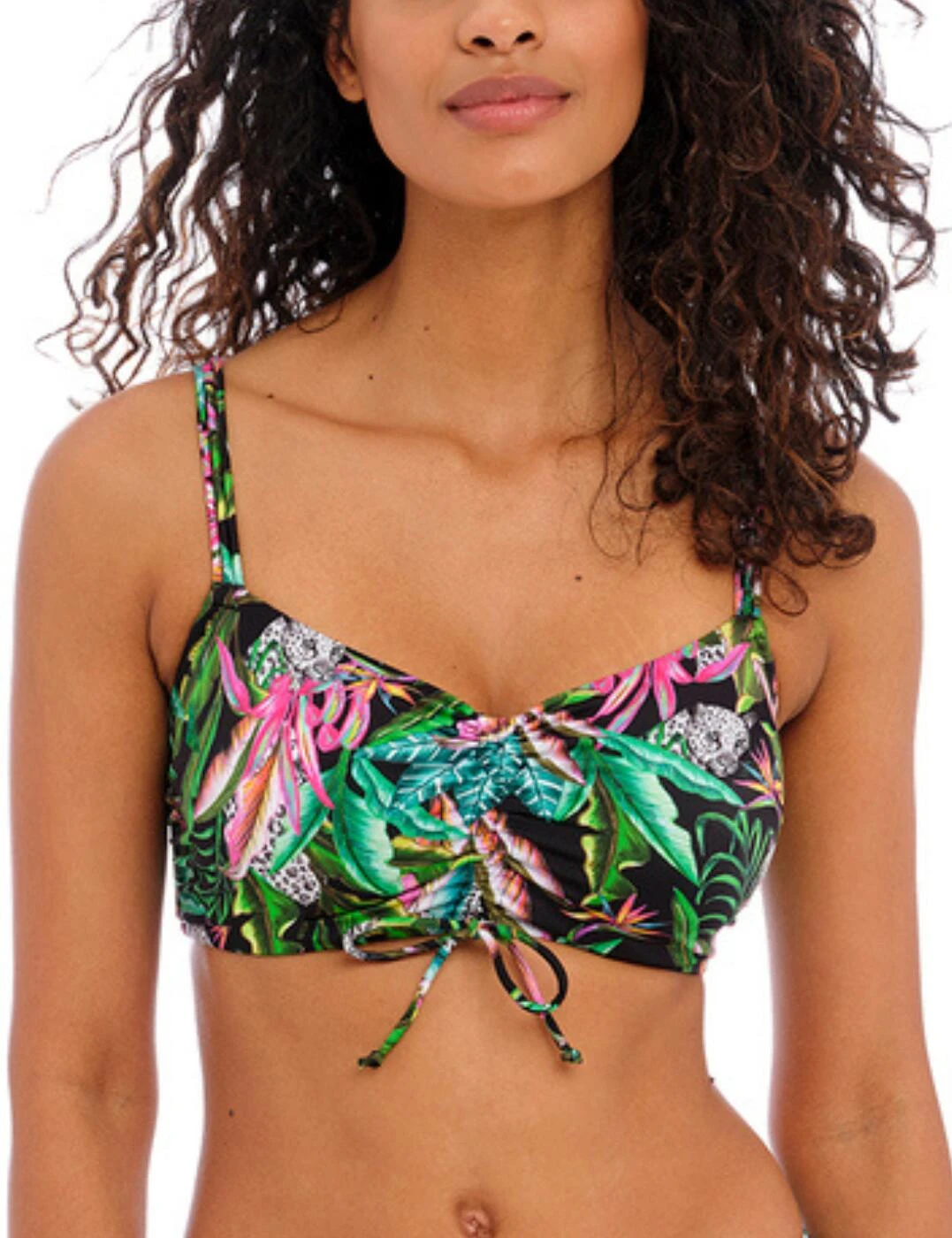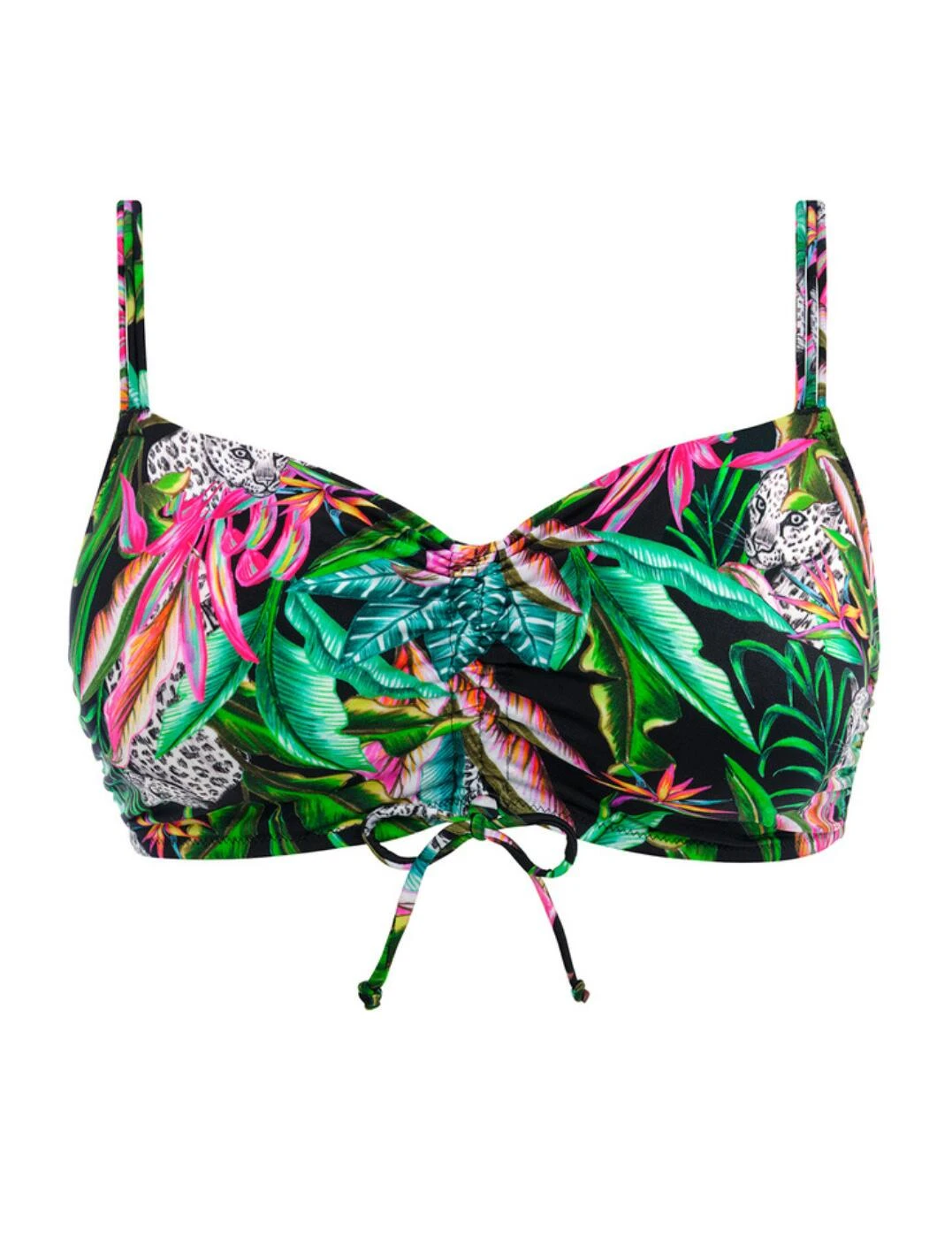 Get ready for your next vacation with Freya’s Cala Selva collection this season. Turn heads with this bold jungle print bralette bikini top. With a concealed underwire and lined cups, this top will give you an extra lift but still stay comfortable and secure. Features gathering at the bust with a self-tie detailing meaning that the neckline can be altered for a versatile fit. The convertible and adjustable shoulder straps mean you can customise the look of this bikini top, whether it be a crossover style or a classic standard look, the choice is yours! Style this bralette bikini top with other available items in the Cala Selva range.