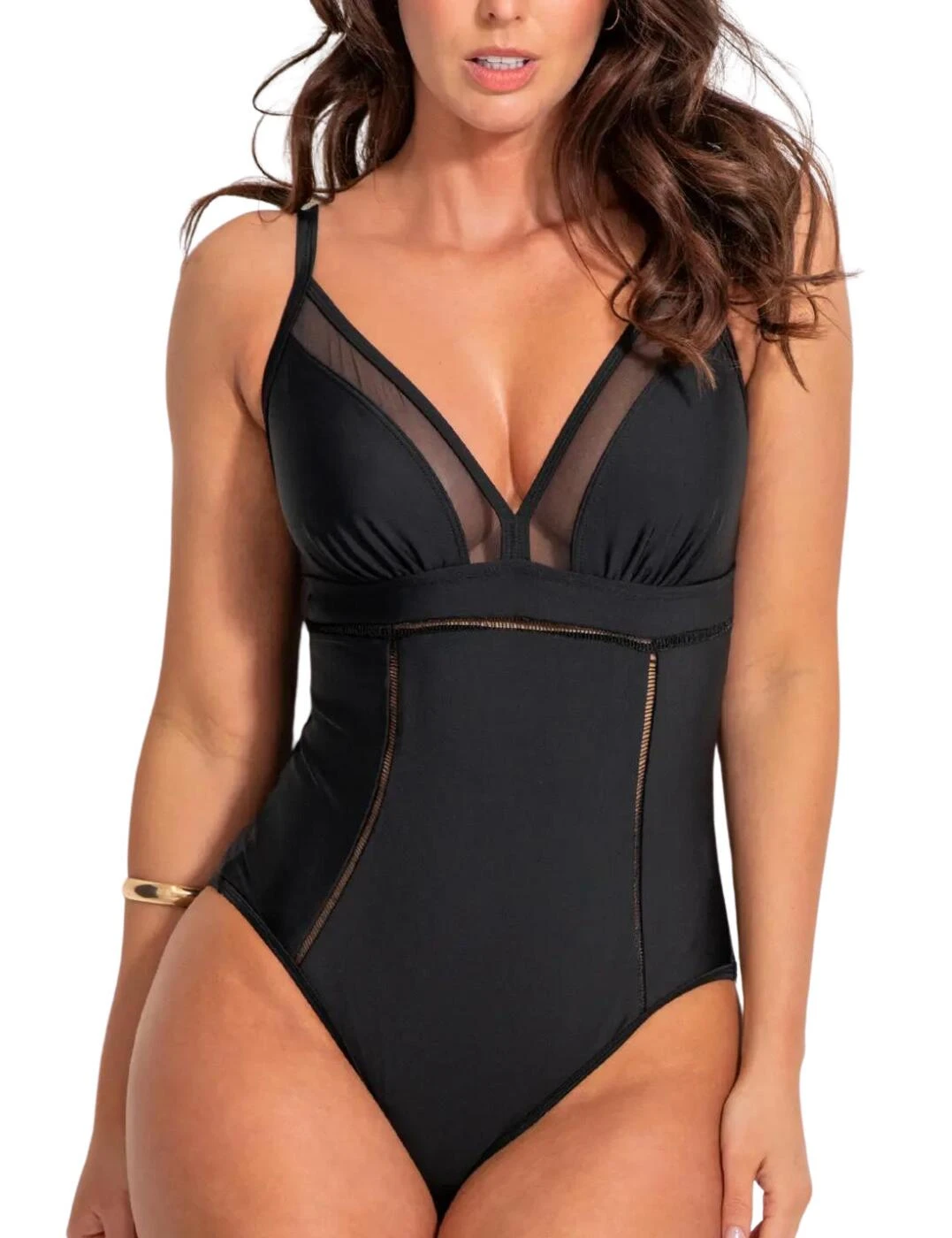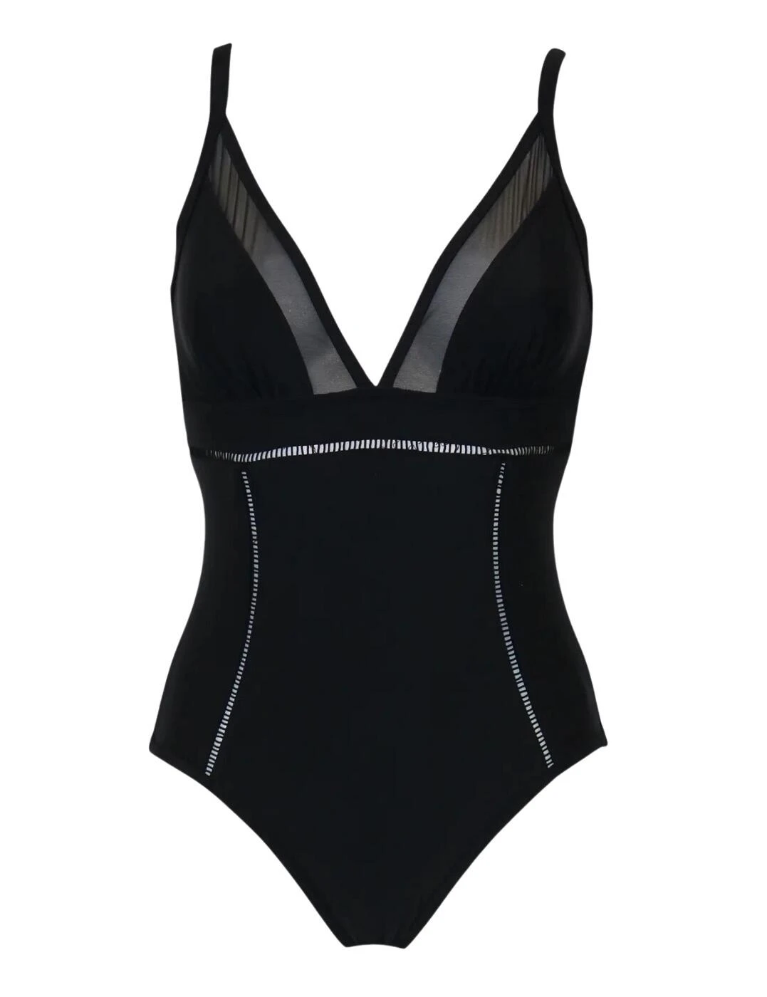 Pour Moi brings you understated swimwear with a chic twist with this control swimsuit. This swimsuit features non-wired, non-padded cups for a comfortable fit that embraces your natural curves. This piece boasts a deep plunging neckline to showcase your decolletage with the semi-sheer mesh trim adding a sultry look. This swimsuit has a simple pull-on design and a moderate rear coverage to provide the utmost comfort whilst still keeping things cheeky. The straps are adjustable so you can customise the fit to your own preference. The innovative tummy control panel adds an extra element of security and contours your body leaving you feeling your most confident self.