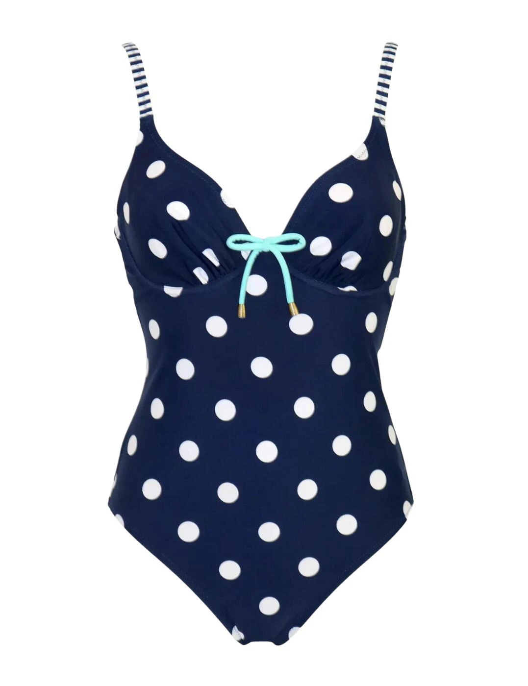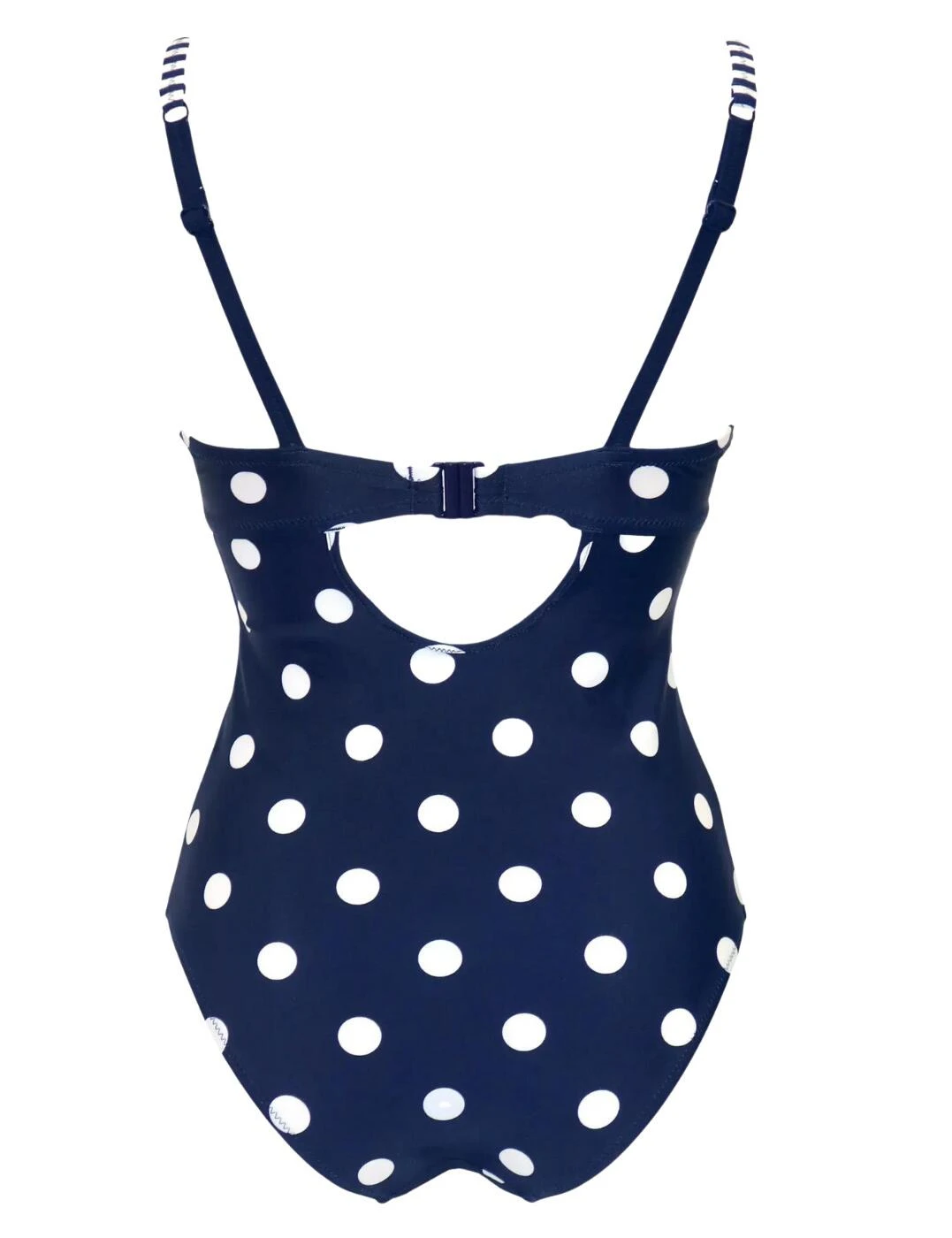 Embody retro glamour with Pour Moi’s Beach House collection this season. This swimsuit features a gorgeous pin-up-inspired polka dot print and a chic contrasting bow detailing on the centre bust for a feminine touch. This piece has a plunging neckline with underwired, non-padded cups for a lifted, supportive look that still embraces and showcases your beautiful curves. Secured at the back with a classic clasp fastening that features a modern cut-out detailing for a flirtatious edge. The shoulder straps boast a fun stripe design and are adjustable so you can tailor this swimsuit to your own personal preference.