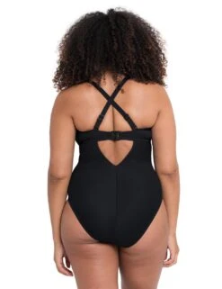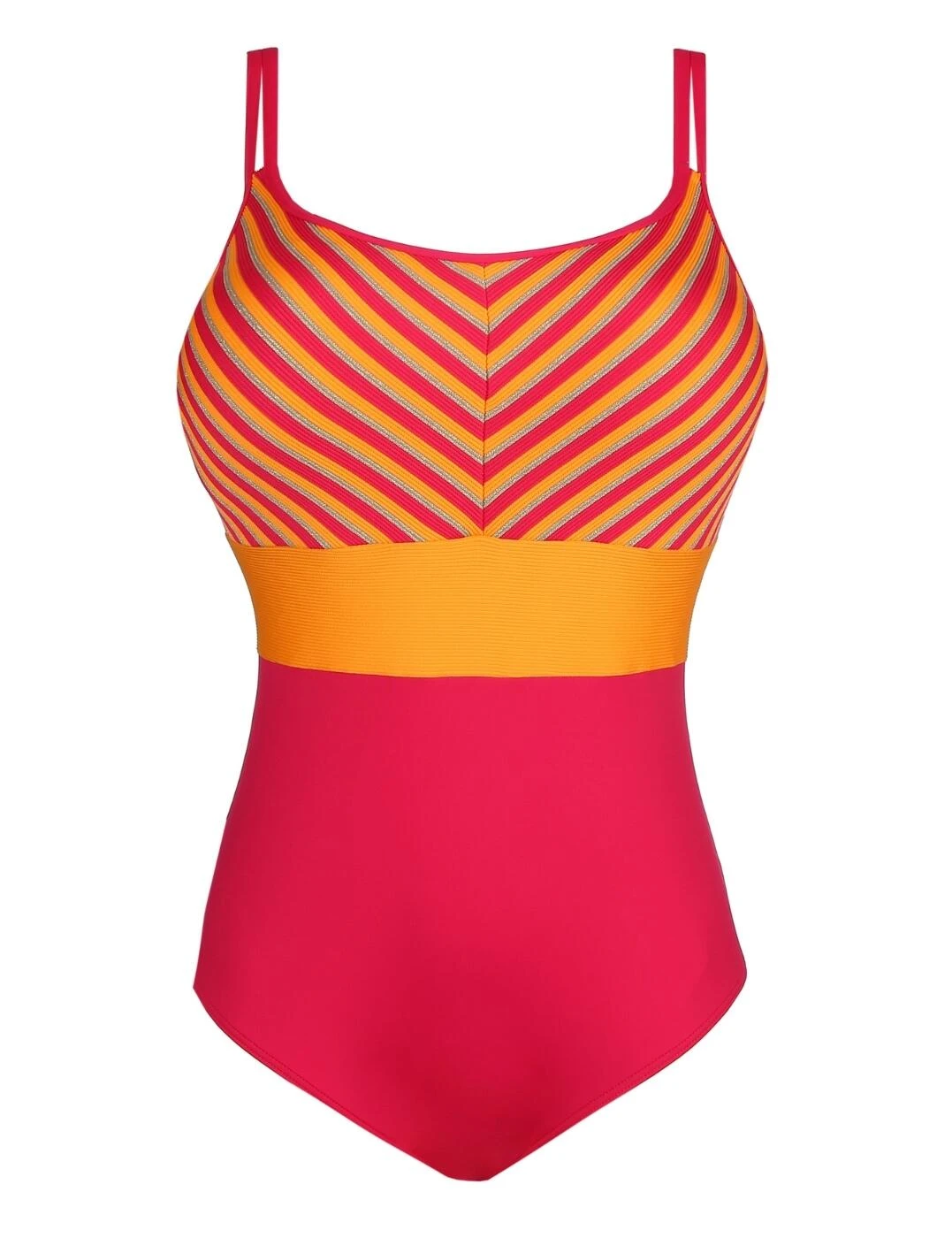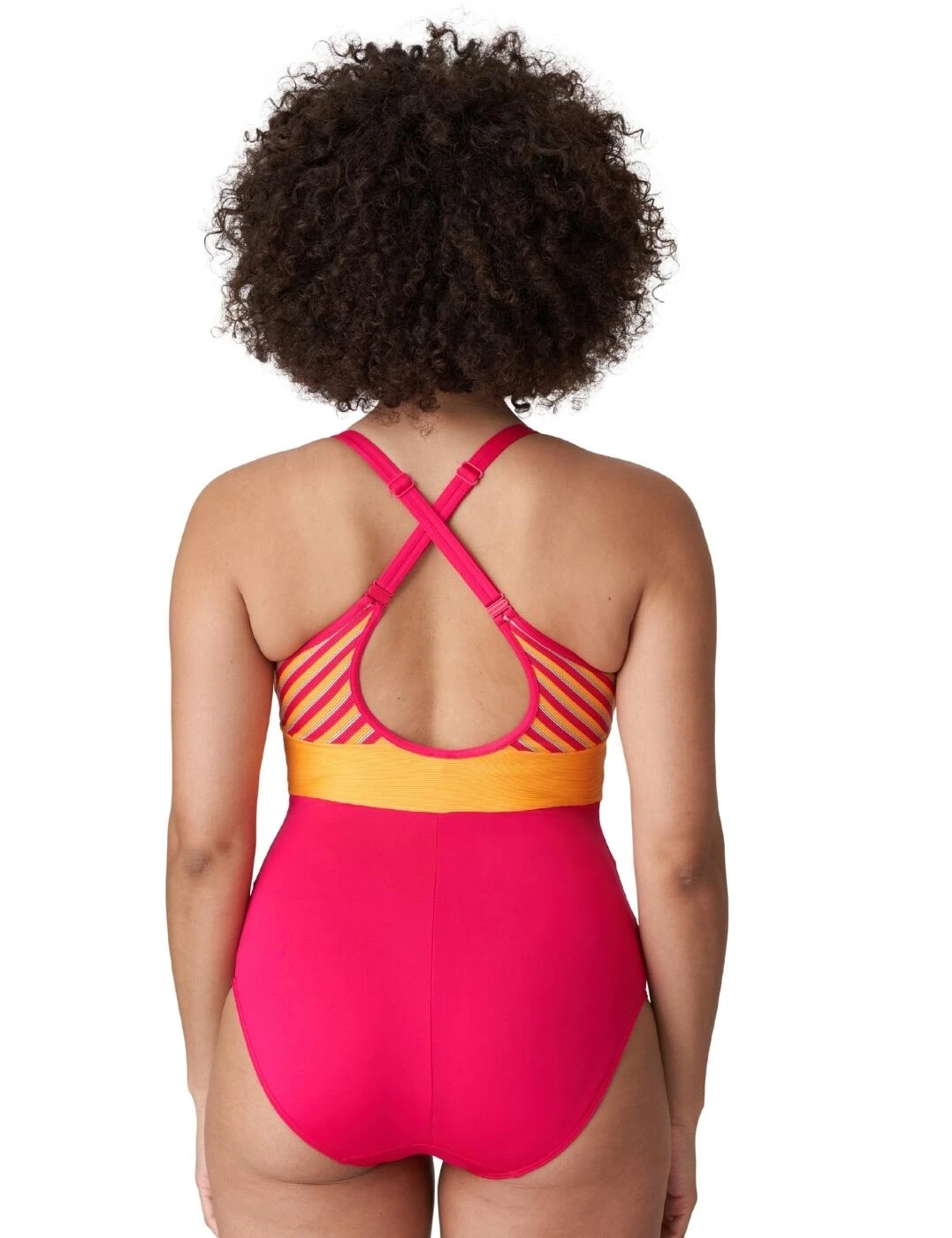 Embrace poolside stylishness with this padded wireless swimsuit from Prima Donna Swim. From the La Concha range, it features an eye-catching design with a striped pattern at the top, a bold metallic belt look and a plain opaque bottom. It has a classic swimsuit shape with good bust coverage, a scooped back, and moderate rear coverage. Padded cups help enhance your bust whilst the wireless feel allows for true comfort. The swimsuit is an easy pull-on style with double adjustable straps that cross at the back giving this chic piece a sporty vibe.