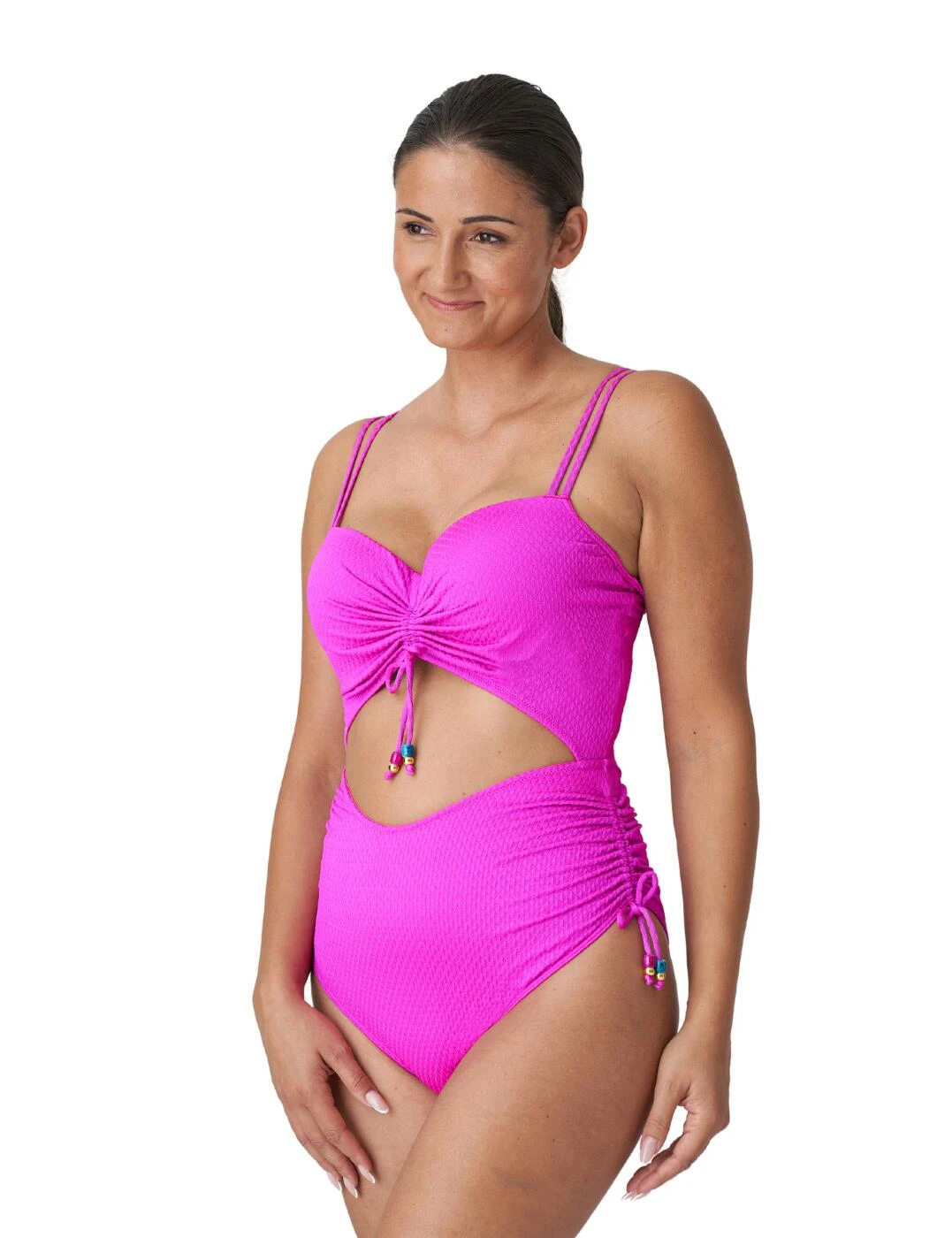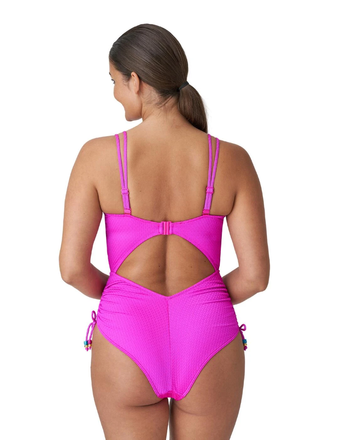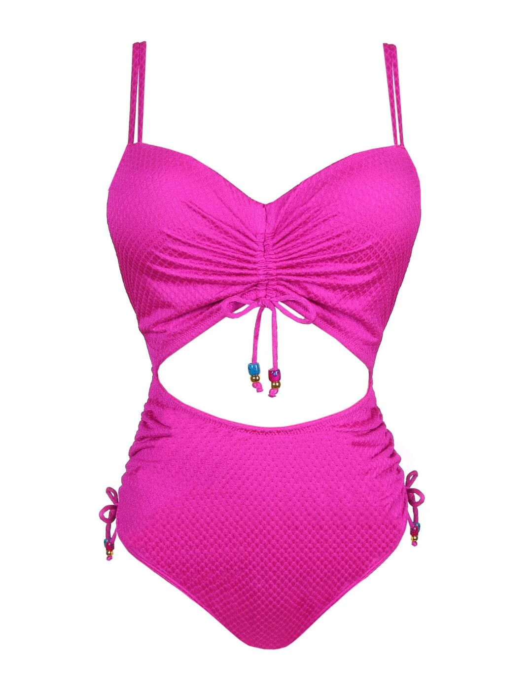 For the ultimate adaptable piece there is no need to look any further. The Narta swimsuit from Prima Donna is exactly what you’ve been looking for. It styles a stunning open back sealed by a plastic snap back clasp fastening. There are two adjustable spaghetti straps that split to create a double strap effect. The cups are padded and combined with underwiring to ensure you have firm support whilst still delivering a delectable cleavage highlighted by the slightly plunging neckline. Decorative pearls can be seen dotted around the piece to add even more vibrancy. Moderate rear coverage is also offered in the swimsuit for a little cheeky exposure. For the main event however, it is the two ruched pieces seen under the bust and along the hip-line. Both these can be altered as much or as little as you like. Ruching the bottom piece can create a higher leg cut and the effect of elongating your legs. Whilst you can make the open torso larger or smaller depending on how you feel. To add even more adaptability the straps can be removed at the rear and crossed if you desire even more security.
