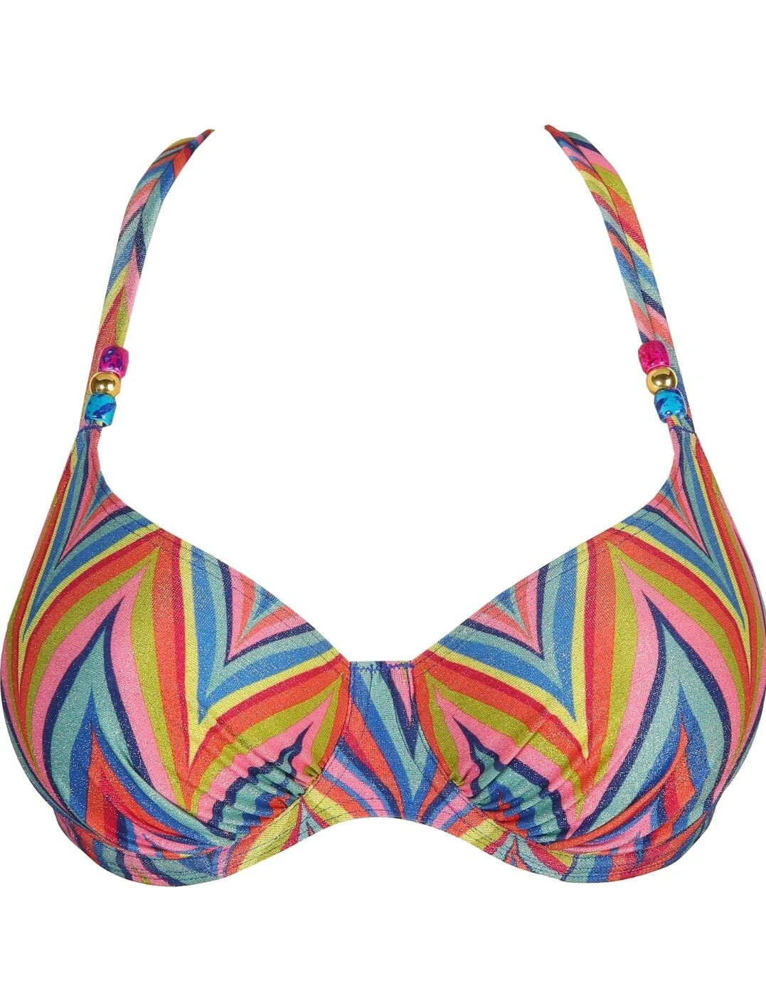 Add a touch of glamour to your luxury swimwear collection with the 70’s inspired Kea collection by Prima Donna. This stylish full cup bikini top has a bold print and is crafted with a luxurious metal fibre creating a sophisticated shimmering finish. The classic full cup design and non-padded cups offer the utmost comfortable fit. Convertible shoulder straps allow this bikini top to be worn in a classic over-the-shoulder style or elegant halterneck design and the bead detailing adds to the luxurious look. Underwiring offers additional support. Team with matching swimwear and beachwear accessories from the stylish Kea collection by Prima Donna.
