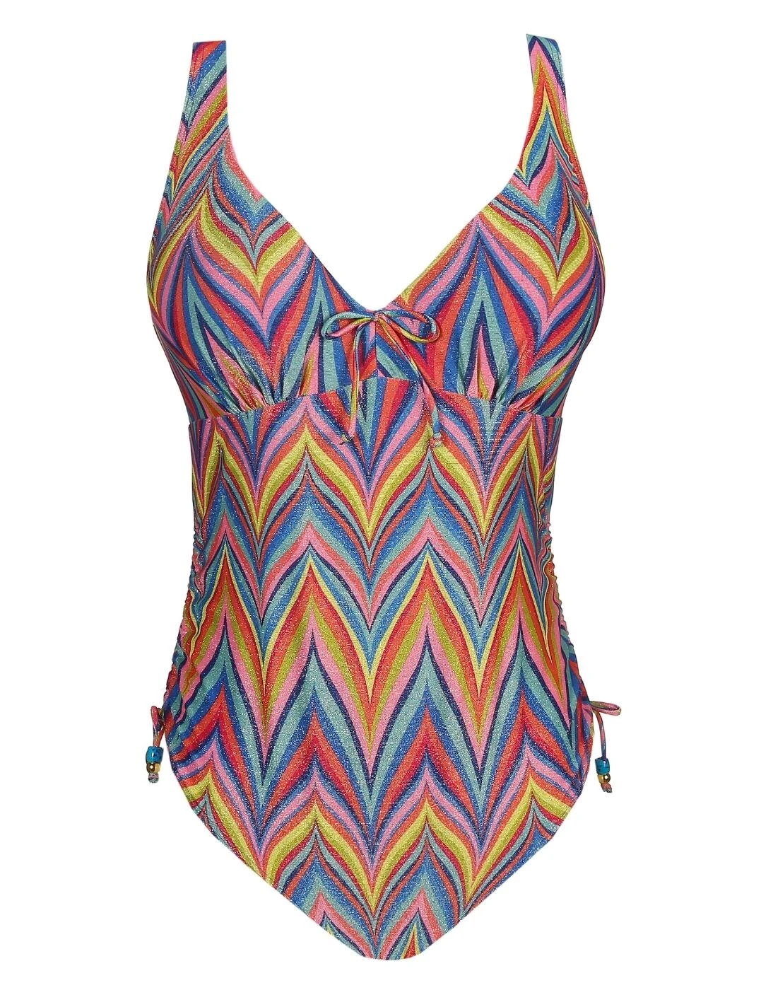 Be beach ready with this stunning luxurious swimsuit from Prima Donna’s Kea line. Wireless and non-padded cups provide a comfortable and flattering fit. This multiway look has adjustable straps that can be converted from a traditional over-the-shoulder style to a halterneck one for a unique and individual look. Adjustable tie sides can tailor rear coverage which can be modified from moderate to full. Ease of wear pull-on design and bow details finish off this zigzag print swimsuit perfectly. To complete this look, take advantage of the matching available coordinates from this range.