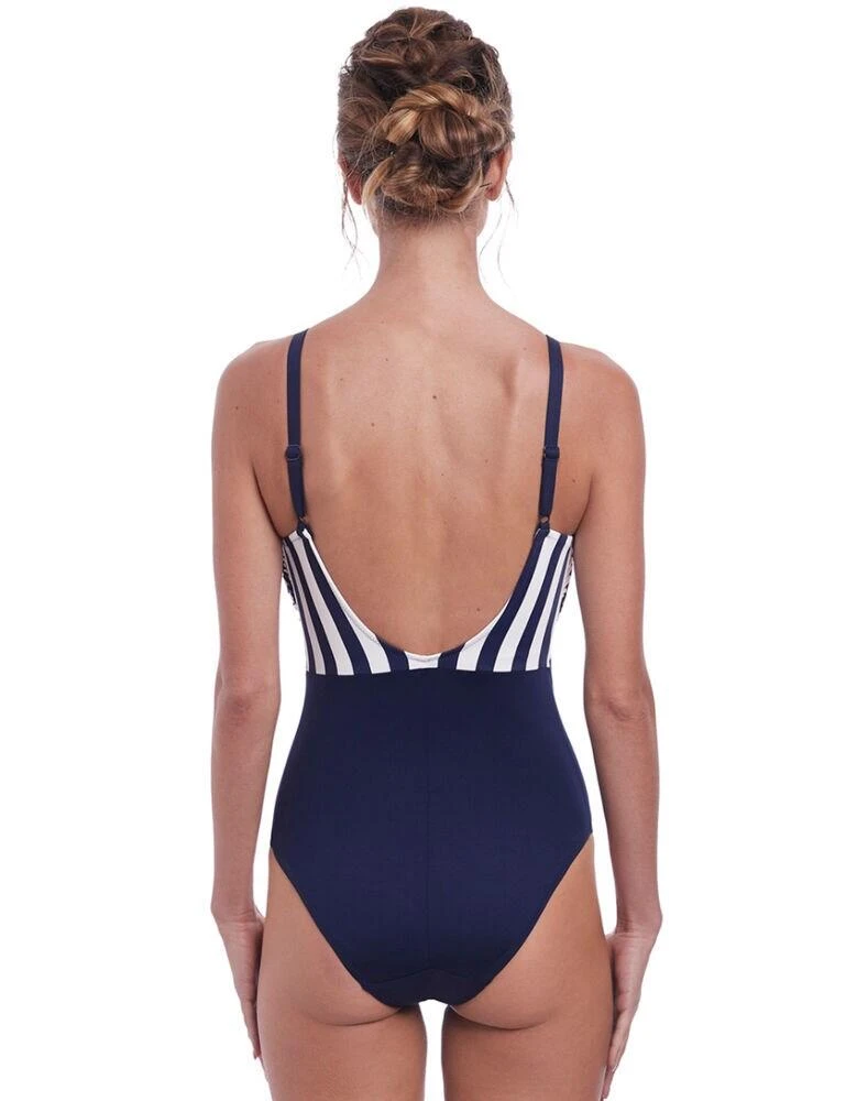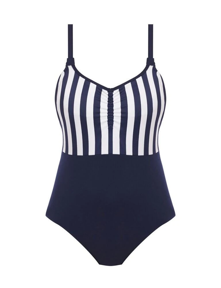 Turn heads in this gorgeous scoop neck swimsuit from the Cote d’Azur range by Freya. This contemporary design contrasts a bold stripe design with a block of colour on the bottom. A flattering scoop neckline combined with a slight gathering in the centre of the bust is very complimentary for the body. The swimsuit has a high leg line and so offers moderate rear coverage. The cups are underwired for maximum support but non-padded for a natural look. The fixed straps are fully adjustable for you to find just the right fit. If you like this design, you will love the matching items from the Cote d’Azur range!