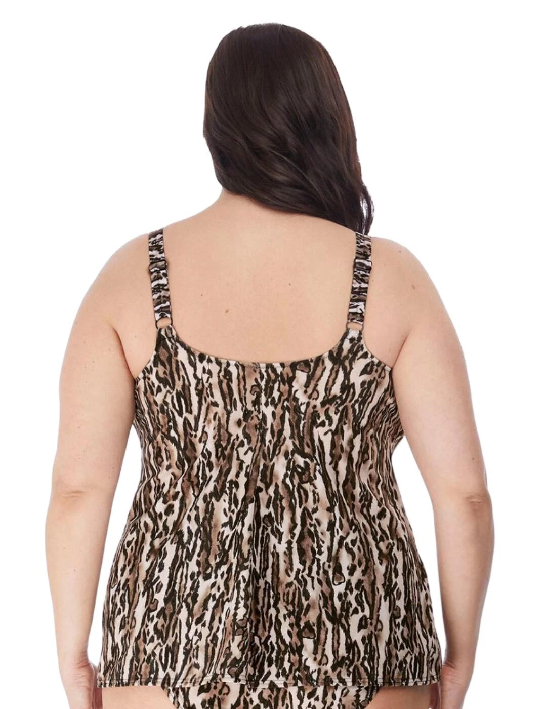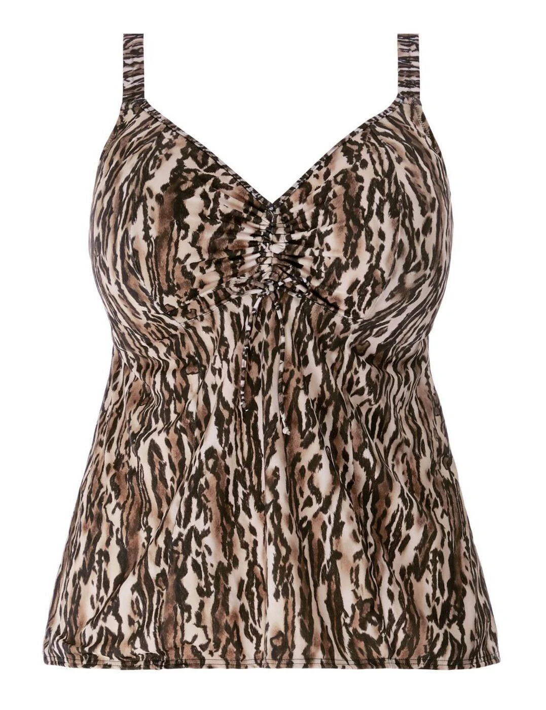 Elomi’s Fierce collection brings you bold statement pieces that your swimwear drawer needs. This tankini top is the perfect addition for your next vacation for a higher coverage design that does not compromise on style. The bold animal-inspired print adds a flirty flair with the adjustable drawstrings on the centre cups allowing you to alter the neckline. The moulded, non-wired cups smooth and create a rounded shape to your bust for an elevated look with the wide underband elastic attached to the lining adding a supportive feel. The straps are adjustable and this tankini top boasts a simple pull-on design for ease of wear.