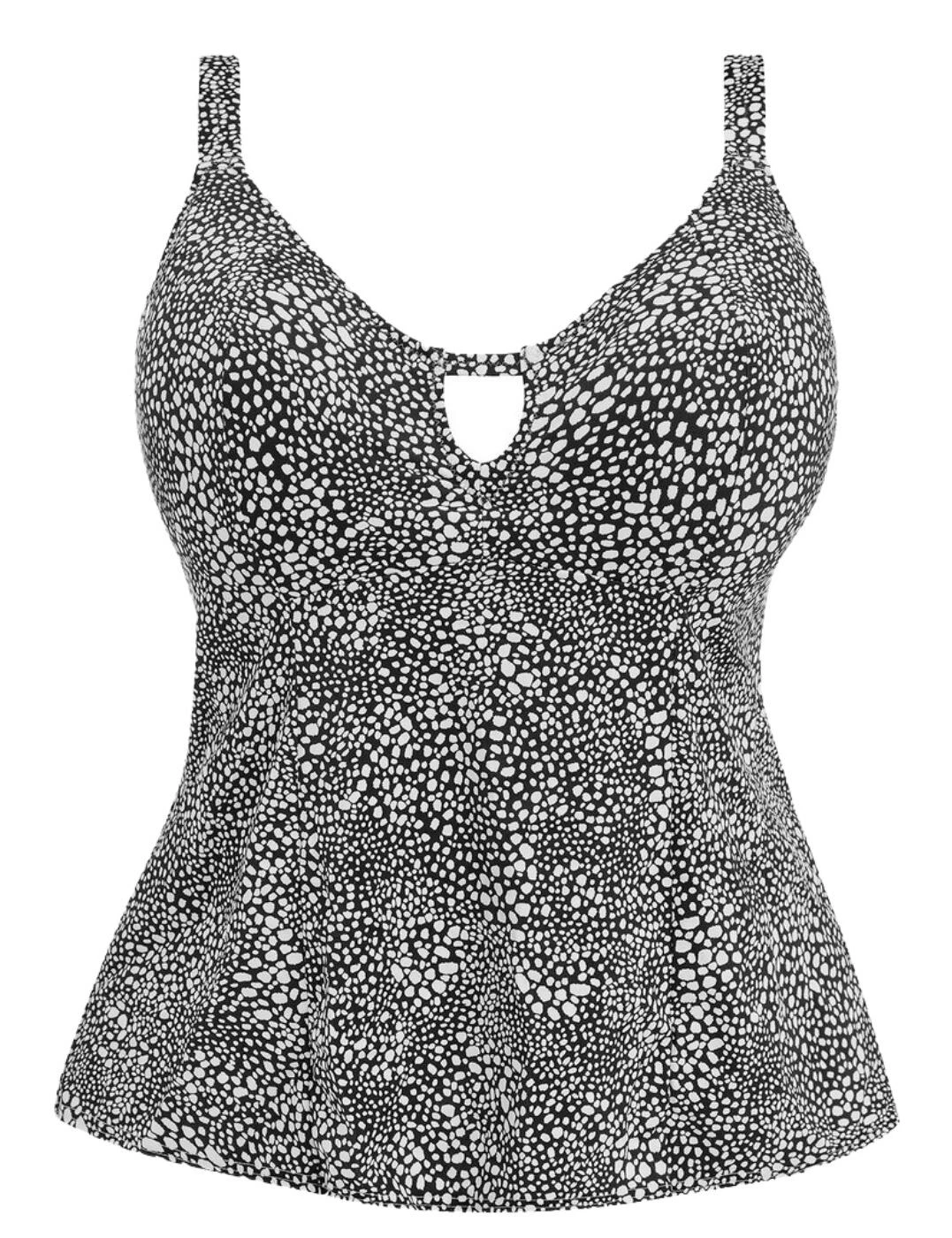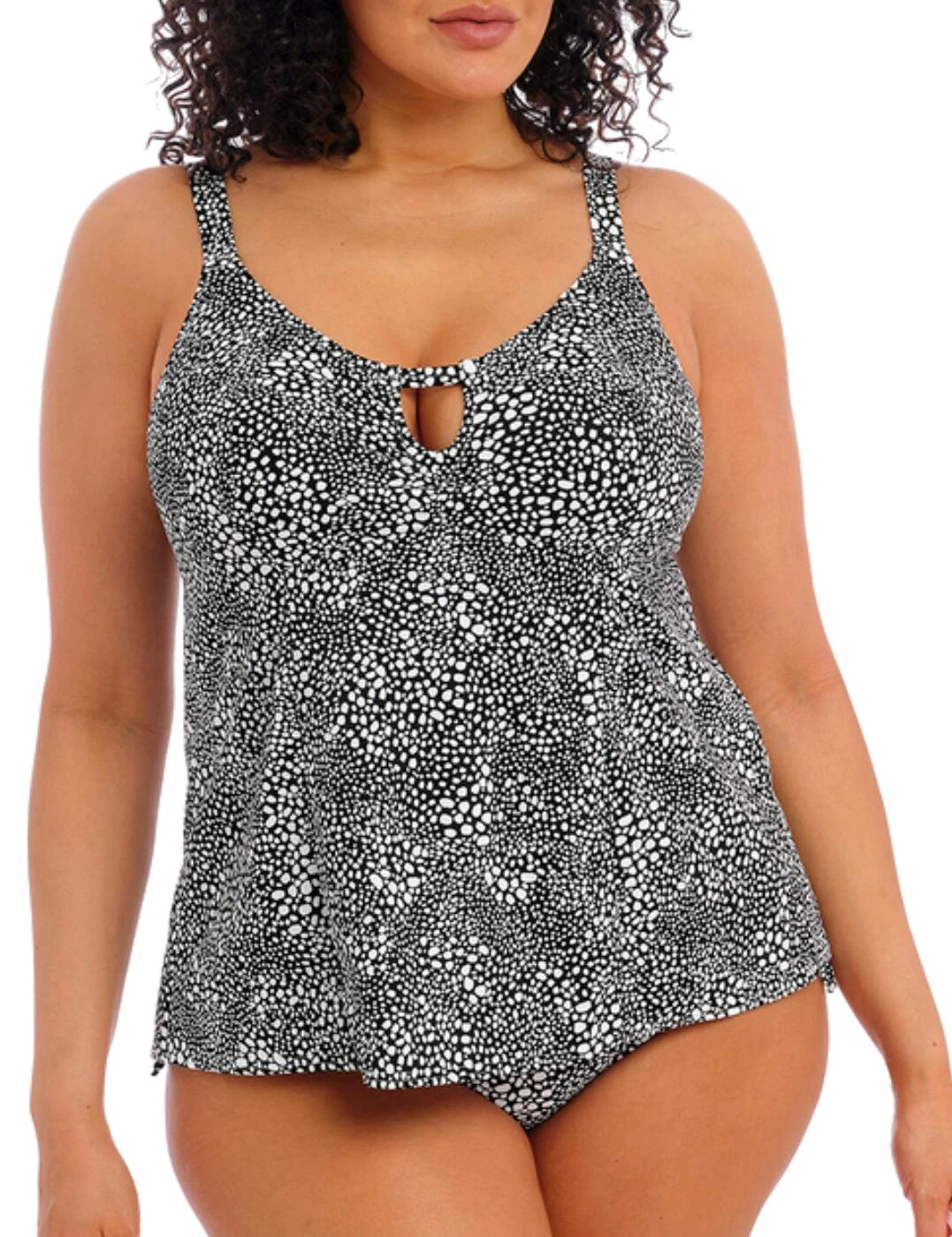 Introducing this eye-catching tankini top from the Pebble Cove range by Elomi that is an absolute must-have in your swimwear collection. This piece has moulded cups and is wireless for the utmost comfort and shape. This flattering flared design has adjustable shoulder straps and a pull-on design which makes this item easy to wear and comfortable. This material is lightweight and made from Lycra Xtra Life material for durability. This chic design has a fashionable print and a stylish keyhole feature in the centre bust, finishing this look off perfectly. To complete this look, take advantage of the matching available coordinates from the stylish Elomi’s Pebble Cove line.