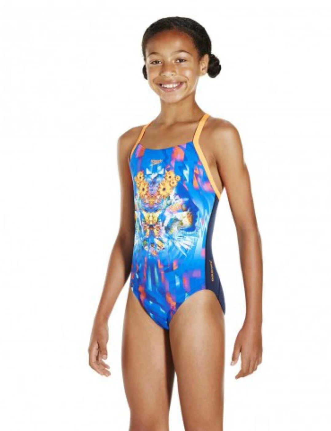 With its beautiful print and comfortable fit, this swimsuit is great for regular swimming. The crossback design of this one piece offers freedom of movement in the water. High stretch fabric and a splashback style back enables young athletes to reach and tumble in comfort, while our soft, Endurance®10 fabric is engineered to retain its shape.