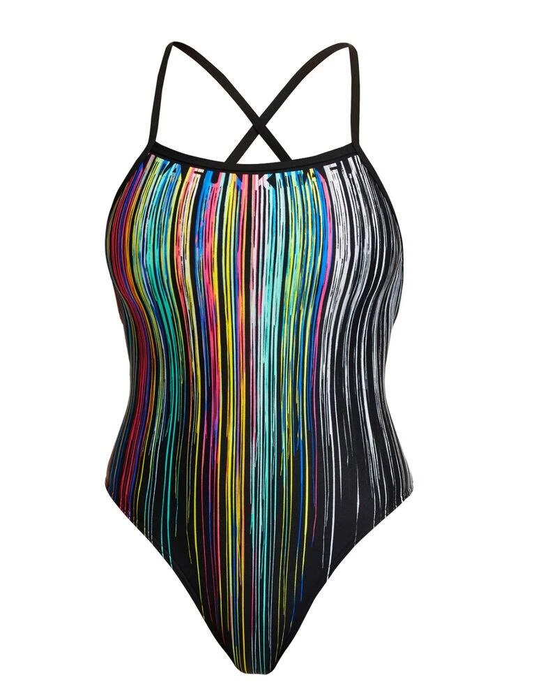 Make a statement in this eye-catching Funkita Strapped In One-Piece swimsuit. This fun and colourful print will get you noticed in your next swim session. Featuring single straps that crisscross down you back, leaving you secure and looking stylish. Cut with higher leg openings for added coverage and modesty and designed with full frontal lining for comfort. Crafted from exclusive C-Infinity fabric with exceptional chlorine resistance, durability and shape retention qualities. This Funkita swimsuit is an excellent choice for both recreational and professional swimmers.