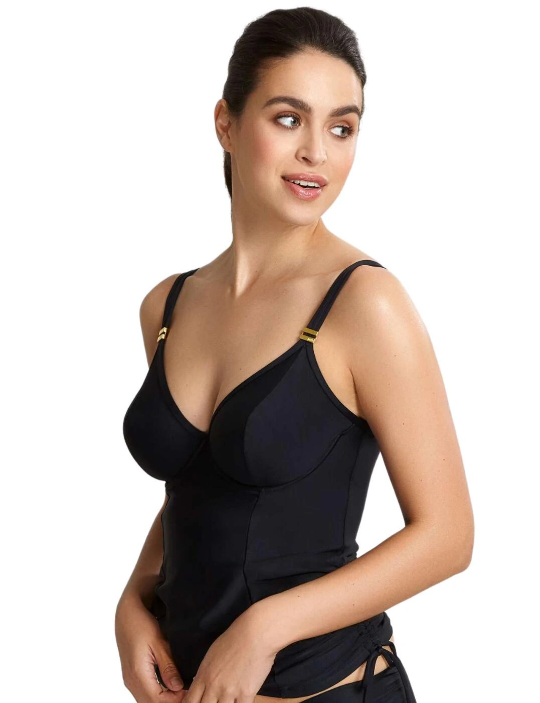 If you’re looking for swimwear that is classy and sophisticated then Panache is perfect for you. The Anja Riva tankini top provides the versatility of a bikini and the coverage of a swimsuit. It features a plunging neckline with non-padded cups. The tankini is simple but has luxurious finishing touches. It has gold finishing detailing on the adjustable split straps. The tankini provides support through the underwiring and has drawstrings to the side allowing you to alter the height.